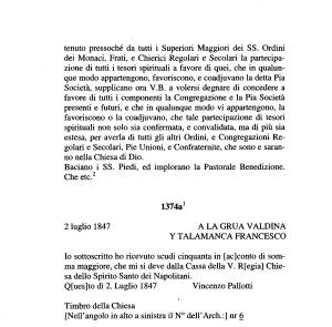 2 Nella summenzionata copia autentica si trova soltanto la supplica , non il rescritto del papa . Quello è pubblicato nelle OOCC IV 96 , nota 1 : Seguono le parole del papa : Die 1 . Julii 1847 / Pro grafia quoad Congr . nunc existentem / Pius P . P . IX .