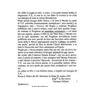 Negli attuali bisogni della Chiesa , e di tutto il Mondo la carità di V . E . potrebbe immensamente moltiplicare i suoi meriti ! ,] se impegnasse tutti i Vescovi del Regno a ordinare Preghiere pubbliche sino a nuovo ordine , come suol farsi quando vengono ordinate le Preghiere ad petendam serenitatem , e ciò tanto più con ragione , quanto il Diluvio dei Mah fisici , e Morali cresce in ogni momento : ma tali Preghiere dovrebbono essere pubbliche non solo , perché da farsi dai Sacerdoti nella celebrazione della S . Messa aggiungendo qualche Colletta , ma pubbliche anche3 perché da farsi in alcune Chiese determinate , e in