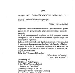 28 luglio 1847 DA LATINI MACIOTI LUIGI AL PALLOTTI Sig [ no ] r Compare1 Padrone Ca [ rissi ] mo