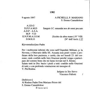 Per i moltissimi infermi che sono nell ’ ospedale Militare , p . la Novena , e Ottavario della SS . Assunta non potrò venire a profittare della loro pazienza , e carità ; che nel lunedì 23 . del corrente ; onde confido nelle loro Orazioni perché venga a partecipare del sommo bene che mi fanno trovare nel S . Eremo .