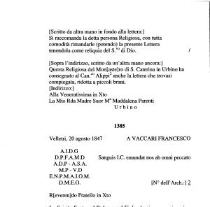 Questa Religiosa del Mon [ aste ] ro di S . Caterina in Urbino ha consegnato al Can . co Alippi2 anche la lettera che trovasi