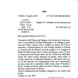 Il progresso dell ’ Opera del Signore colla richiesta di varie persone , e col desiderio di Mogr Suffraganeo1 mi obbliga a predicare nel Triduo solenne che si celebra nei giorni 24.25.26 in memoria , e ringraziamento di varii Prodigi ottenuti in Velletri p . intercessione di Mariaf ,] invocata innanzi la S . Imagine di