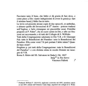 nell ’ inglese , e farlo ristampare mi piacerebbe assai . Potrebbe proporlo al P . Faber2 , che di cuore saluto in Dio , e alle cui Orazioni mi raccomando , e di tutti del Collegio di S . Wilfrido . Tutti della Congregazione salutiamo in Dio V . R . e D . Giuseppe Faà : tutte le Benedizioni del Paradiso : tutte le Benedizioni del Paradiso . Ella come veste ? Si può portare l ’ abito talare ? Quando haec erunt ?