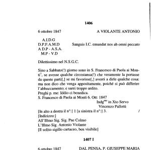 Preghi p . me : Iddio ci benedica . S . Francesco di Paola ai Monti 6 . Ott : 1847