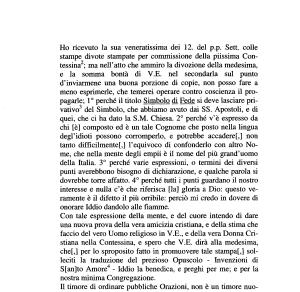 e la somma bontà di V . E . nel secondarla sul punto d ’ inviarmene una buona porzione di copie , non posso fare a meno esprimerle , che temerei operare contro coscienza il propagarle ; 1 ° perché il titolo Simbolo di Fede si deve lasciare privativo3 del Simbolo , che abbiamo avuto dai SS . Apostoli , e di