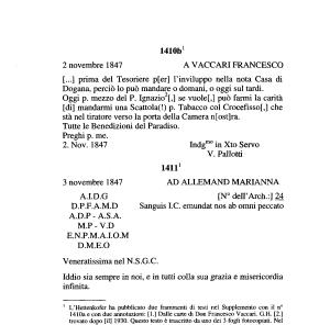 1410a e con due annotazioni : [ 1 .] Dalle carte di Don Francesco Vaccari . G . H . [ 2 .] trovato dopo [ il ] 1930 . Questo testo è trascritto da uno dei 3 fogli fotocopiati . Nel margine laterale a sinistra è scritto di nuovo Vaccari e la missiva è indubbiamente destinata a quest ’ ultimo . Il primo frammento , scritto e firmato dal Pallotti , manca della parte iniziale e comincia con le parole : ... prima del Tesoriere . I frammenti sono pubblicati anche nelle OOCC IV lOlss .