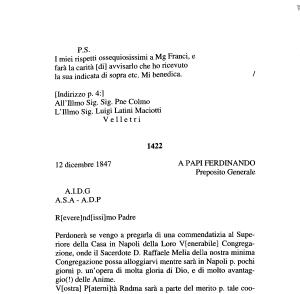 Perdonerà se vengo a pregarla di una commendatizia al Superiore della Casa in Napoli della Loro Venerabile ] Congregazione , onde il Sacerdote D . Raffaele Melia della nostra minima