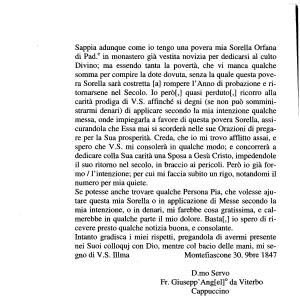 Intanto gradisca i miei rispetti , pregandola di avermi presente nei Suoi colloquj con Dio , mentre col bacio delle mani , mi segno di V . S . filma Montefiascone 30 . 9bre 1847