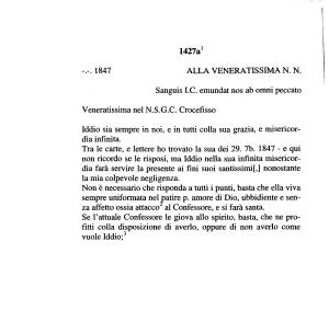 1 La lettera è costituita da diversi pezzetti di carta incollati . È chiaramente di pugno del Pallotti , ma non porta il nome della destinataria , né firma , né indirizzo , né data . Certamente è stata scritta dopo il 29 settembre 1847 , come evidenziato nel testo che l ’ Hettenkofer ha pubblicato nel Supplemento con il n ° 1427a e l ’ annotazione : “ trovato dopo [ il ] 1930 ”.