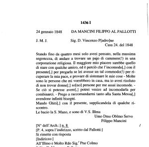 24 gennaio 1848 DA MANCINI FILIPPO AL PALLOTTI J . M . J .