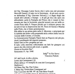 Mercoldì Santo [,] il tutto sia in Sermoneta - di più non conviene defraudare il Sig . Giacomo Salvati [;] / si degni dirgli che mandi altri Libretti , e Stampe - e di più gli dica che ajuti con abbondante carità la Famiglia del Pittore che è venuto in Sermoneta per fare le Iscrizioni , giacché tornerà con noi nella seconda Festa della S . Pasqua poiché qui è richiesto presso che da tutti di fare la Impressione dei SS . Nomi di G [ esù ] e M [ aria ] nelle Porte , che si fanno gratuitamente .