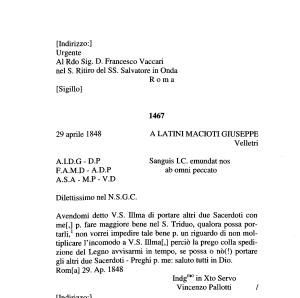 Avendomi detto V . S . Illma di portare altri due Sacerdoti con me [,] p . fare maggiore bene nel S . Triduo , qualora possa portarli , 1 non vorrei impedire tale bene p . un riguardo di non moltiplicare l ’ incomodo a V . S . Hlma [,] perciò la prego colla spedizione del Legno avvisarmi in tempo , se possa o nò (!) portare gli altri due Sacerdoti - Preghi p . me : saluto tutti in Dio . Rom [ a ] 29 . Ap . 1848