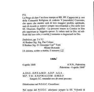 1 Questa lettera , “ trovata nel 1932 ” come scrive l ’ Hettenkofer sul retro , è costituita da due frammenti di carta ri-incollati . Non sappiamo a chi fosse destinata , e sempre l ’ Hettenkofer scrive N . N . Non porta la firma del Palloni , anche se è scritta di suo pugno .