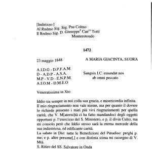 La saluto in Dio : tutte le Benedizioni del Paradiso : preghi p . me ; e p . altre persone [,] e con distinta stima mi rassegno di V . Mtà . S . Ritiro del SS . Salvatore in Onda 23 . Maggio 1848