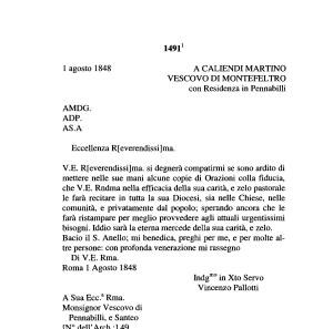 V . E . R [ everendissi ] ma . si degnerà compatirmi se sono ardito di mettere nelle sue mani alcune copie di Orazioni colla fiducia , che V . E . Rndma nella efficacia della sua carità , e zelo pastorale le farà recitare in tutta la sua Diocesi , sia nelle Chiese , nelle comunità , e privatamente dal popolo ; sperando ancora che le farà ristampare per meglio provvedere agli attuali urgentissimi bisogni . Iddio sarà la eterna mercede della sua carità , e zelo .