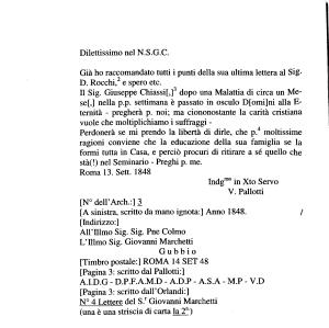 Gubbio [ Timbro postale :] ROMA 14 SET 48 [ Pagina 3 : scritto dal Pallotti :] A . I . D . G - D . P . F . A . M . D - A . D . P - A . S . A - M . P - V . D [ Pagina 3 : scritto dall ’ Orlandi :] N ° 4 Lettere del S . r Giovanni Marchetti ( una è una striscia di carta la 2a )