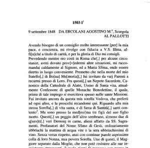Prevedendo mentre ero costì in Roma chef ,] per alcune circostanze , avrei dovuto provvedermi altre situazioni , mi raccomandai caldamente al Signore , ed a Maria SSma , onde essere diretto in luogo conveniente . Premetto che nella morte del mio fratello [,] di Bo [ na ] Me [ moria ][,] fui invitato da varj Parenti a recarmi presso di Loro . Fra questi [,] un Nepote Sacerdote , Canonico della Cattedrale di Alatri , Uomo di Santa vita , attualmente Confessore di quelle Monache Benedettine , il quale , prima di tale impiego si esercitava spesso nelle sante Missioni .