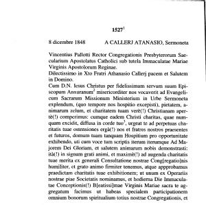 Cum D . N . lesus Christus per fidelissimum servum suum Episcopum Anxuranum12 misericorditer nos vocaverit ad Evangelicum Sacrarum Missionum Ministerium in Urbe Sermoneta explendum , ( quo tempore nos hospitio excepisti ), pietatem , a- nimarum zelum , et charitatem tuam verè (!) Christianam apertè (!) comperimus : cumque eadem Christi charitas , quae numquam excidit , diffusa in corde tuo3 , urgeat te ad perpetuas charitatis tuae ostensiones ergà (!) nos et frattes nostros praesentes et futures , domum tuam tanquam Hospitium prò opportunitate exhibendo , uti cum voce tum scriptis iterum iterumque Ad Majoretti Dei Gloriam , et salutem animarum nobis demonsttasti : ità (!) in signum grati animi , et maximè (!) ad augenda charitatis tuae merita ex generali Consultatione nostrae Cong [ regatio ] nis humiliter , et grato animo firmiter tenemus , atque appprobamus praedictam charitatis tuae exhibitionem ; ut unum ex Operariis nostrae piae Societatis nominamus , et hodiema Die Immaculatae Conceptionis (!) B [ eatissi ] mae Virginis Mariae sacra te aggregatum facimus ut habeas specialem participationem omnium bonorum spiritualium totius nostrae Congregationis , et