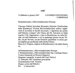 Vicario G [ enera ] le di N [ ostro ] Sfignore ] [ Seguono , autografe , le parole del Card . Patrizi :] 12 . Februarii 1847 Annuimus juxta perita C [ onstantinus ] Card . Vicarius . [ Segue , scritto dal Pallotti :]