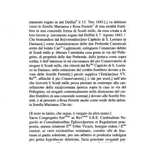 Che bramandosi dal Re [ verendissi ] mo Capitolo di S . Lorenzo in Damasof ,] come Amministratore delle due Prebende Canonicali erette dal lodato Canco Laghimonti , estinguere l ’ enunciato debito di Scudi mille p . liberare l ’ anzidetta casa posta in via del Pellegrino , di proprietà delle due Prebende , dalla ipoteca come sopra scritta , è dell ’ interesse in tal circostanza del pio Conservatorio di erogare li Scudi mille , che ritirerà dal Remo Capitolo di S . Lorenzo in Damaso , nella estinzione del credito fruttifero dovuto a favore delle Sorelle Ferretti [;] perciò supplica l ’ Em [ ine ] nze W .