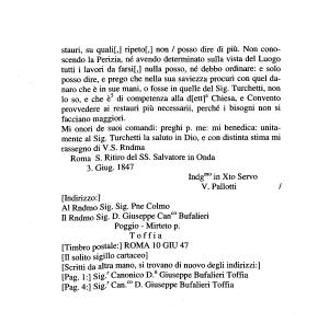 stauri , su quali [,] ripeto [,] non / posso dire di più . Non conoscendo la Perizia , né avendo determinato sulla vista del Luogo tutti i lavori da farsi [,] nulla posso , né debbo ordinare : e solo posso dire , e prego che nella sua saviezza procuri con quel danaro che è in sue mani , o fosse in quelle del Sig . Turchetti , non lo so , e che è5 di competenza alla d [ ett ] a Chiesa , e Convento