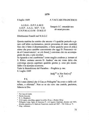 Questa mattina ho sentito che ancora v ’ è qualche pericolo a girare coll ’ abito ecclesiastico , perciò procurino di stare cautelati fino che è fatto il disarmamento , e forse qualche poco di più [;] stimo che poco sarebbe conveniente che oggi D . Francesco vada al Conservatorio1 , se ciò fossef ,] conviene che sia accompagnato da uno , o più secolari .