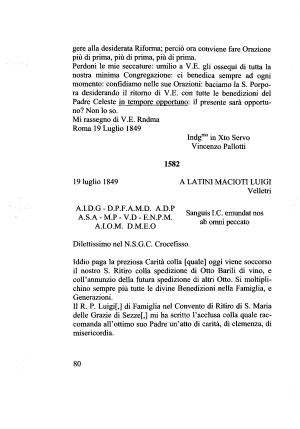 Perdoni le mie seccature : umilio a V . E . gli ossequi di tutta la nostra minima Congregazione : ci benedica sempre ad ogni momento : confidiamo nelle sue Orazioni : baciamo la S . Porpora desiderando il ritorno di V . E . con tutte le benedizioni del