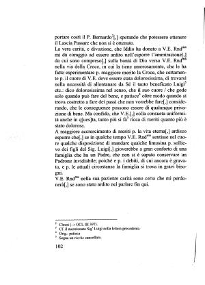 La vera carità , e divozione , che Iddio ha donato a V . E . Rndma mi dà coraggio ad essere ardito nell ’ esporre l ’ ammirazione [,] da cui sono compreso [,] sulla bontà di Dio verso V . E . Rndma nella via della Croce , in cui la tiene amorosamente , che le ha fatto esperimentare p . maggiore merito la Croce , che certamente p . il cuore di V . E . deve essere stata dolorosissima , di trovarsi nella necessità di allontanare da Sé il tanto beneficato Luigi