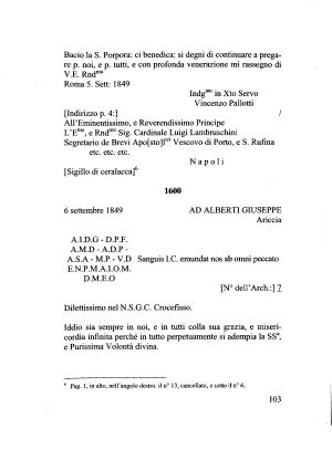Bacio la S . Porpora : ci benedica : si degni di continuare a pregare p . noi , e p . tutti , e con profonda venerazione mi rassegno di V . E . Rndma