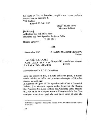 In riguardo all ’ opera di Dio a profitto della Città , e Diocesi di Velletri [,] ho ricevuto risposta molto favorevole dal Rndmo Sig . Arciprete Cella , ma l ’ ottimo Sig . Giuseppe Latini Maciotti (!) non mi ha fatto sapere niente sull ’ acquisto delle due Case contigue : sono sicuro però che non stà in ozio : gli dica che