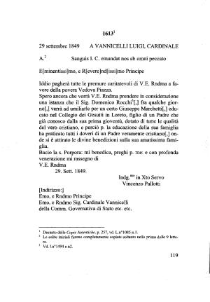 Spero ancora che vorrà V . E . Rndma prendere in considerazione una istanza che il Sig . Domenico Rocchi123 [,] fra qualche giorno [,] verrà ad umiliarle per un certo Giuseppe Marchetta ,] educato nel Collegio dei Gesuiti in Loreto , figlio di un Padre che già conosco dalla sua prima gioventù , dotato di tutte le qualità del vero cristiano , e perciò p . la educazione della sua famiglia ha praticato tutti i doveri di un Padre veramente cristianof ,] onde si è attirato le divine benedizioni sulla sua amatissima famiglia .