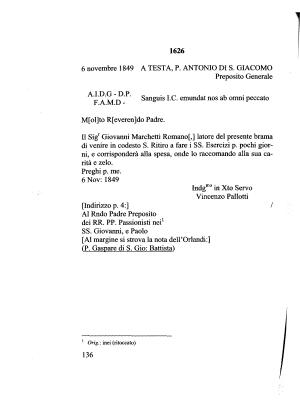 Il Sigr Giovanni Marchetti Romano [,] latore del presente brama di venire in codesto S . Ritiro a fare i SS . Esercizi p . pochi giorni , e corrisponderà alla spesa , onde lo raccomando alla sua carità e zelo .