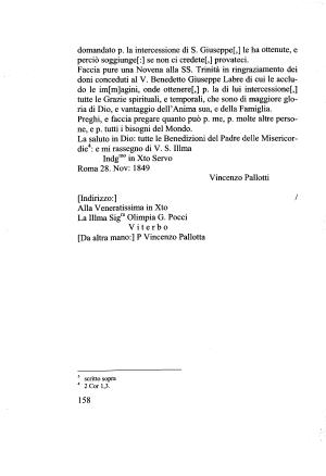 Faccia pure una Novena alla SS . Trinità in ringraziamento dei doni conceduti al V . Benedetto Giuseppe Labre di cui le accludo le im [ m ] agini , onde ottenere [,] p . la di lui intercessione [,] tutte le Grazie spirituali , e temporali , che sono di maggiore gloria di Dio , e vantaggio dell ’ Anima sua , e della Famiglia . Preghi , e faccia pregare quanto può p . me , p . molte altre persone , e p . tutti i bisogni del Mondo .
