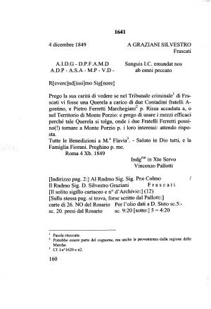 Prego la sua carità di vedere se nel Tribunale criminale1 di Frascati vi fosse una Querela a carico di due Contadini fratelli A- gostino , e Pietro Ferretti Marchegiani12 p . Rissa accaduta a , o