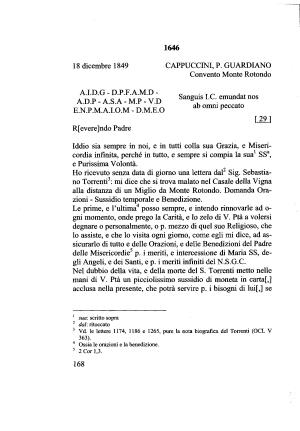 Ho ricevuto senza data di giorno una lettera dal12 Sig . Sebastiano Torrenti3 : mi dice che si trova malato nel Casale della Vigna alla distanza di un Miglio da Monte Rotondo . Domanda Orazioni - Sussidio temporale e Benedizione .