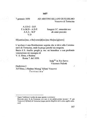 Ricevuto poco fa da Prosinone ove non si era prima potuto trovare = P . già Ves [ covo ] S [ illani ] di Terracina [ segue parola illegibile ed il solito sigillo cartaceo ]