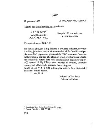 Ho fiducia chef ,] se il Sig Filippo si trovasse in Roma , secondo il solito [,] darebbe per carità almeno due Mille Crocifissetti per dispensarli al popolo nel giorno della SS Comunione Generale della Epifania ; capisco che ella non vorrà prendersi una libertà , ma se crede di poterli dare colla condizione di pagarne l ’ importo [,] qualora il Sig Filippo non credesse di donarli , potrebbe consegnarli al latore del presente Fratel ’ Angelo12 .