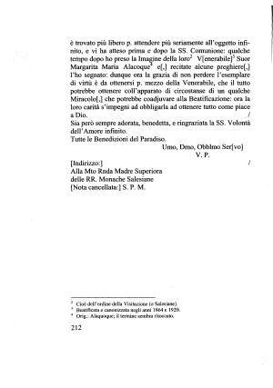 Margarita Maria Alacoque4 e [,] recitate alcune preghiere [,] l ’ ho segnato : dunque ora la grazia di non perdere l ’ esemplare di virtù è da ottenersi p . mezzo della Venerabile , che il tutto potrebbe ottenere coll ’ apparato di circostanse di un qualche Miracolo [,] che potrebbe coadjuvare alla Beatificazione : ora la loro carità s ’ impegni ad obbligarla ad ottenere tutto come piace a Dio . /