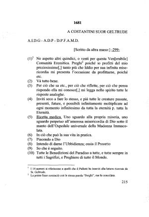 ( 5 ) Ricetta medica . Uno sguardo alla propria miseria , uno sguardo perpetuo all ’ amorosa misericordia di Dio sotto il manto dell ’ ospedale universale della Madonna Immacolata . ( 6 ) In ciò che può la sua vita in pratica . ( 7 ) Piacendo a Dio ( 8 ) Intendo di dame l ’ ubbidienza ; ossia il Precetto ( 9 ) So che è seguito . ( 10 ) Tutte le Benedizioni del Paradiso a tutte , e tutte sempre in tutti i Sagrifizi , e Preghiere di tutto il Mondo .
