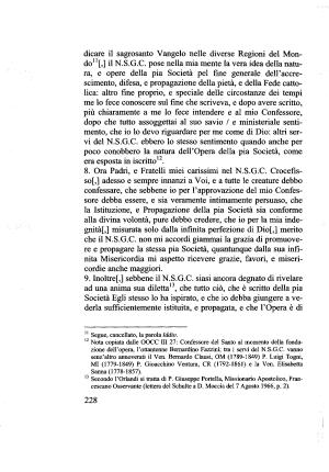 • • • 12 era esposta m iscritto . 8 . Ora Padri , e Fratelli miei carissimi nel N . S . G . C . Crocefisso [,] adesso e sempre innanzi a Voi , e a tutte le creature debbo confessare , che sebbene io per l ’ approvazione del mio Confessore debba essere , e sia veramente intimamente persuaso , che la Istituzione , e Propagazione della pia Società sia conforme alla divina volontà , pure debbo credere , che io per la mia indegnità [,] misurata solo dalla infinita perfezione di Dio [,] merito che il N . S . G . C . non mi accordi giammai la grazia di promuovere e propagare la stessa pia Società , quantunque dalla sua infinita Misericordia mi aspetto ricevere grazie , favori , e misericordie anche maggiori .