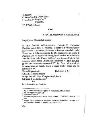 Quaranta Ore ad oggetto di raccogliere limosina per sollecitare la edificazione della Chiesa di Ormi3 , ove i nostri Fratelli Cattolici per essere senza Chiesa , sono chiamati - i privi di Chiesa , del che vivamente comosso l ’ Emo Sig . Card : Vicario di già la raccomandò ai Fedeli . Bacio il sagro anello : prego che mi benedica : e etc .