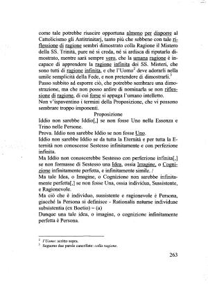 Cattolicismo gli Antitrinitaij , tanto più che sebbene con tale riflessione di ragione sembri dimostrato colla Ragione il Mistero della SS . Trinità , pure né si creda , né si ardisca di riputarlo dimostrato , mentre sarà sempre vero , che la umana ragione è incapace di apprendere la ragione infinita dei SS . Misteri , che sono tutti di ragione infinita , e che l ’ Uomo2 deve adorarli nella umile semplicità della Fede , e non pretendere di dimostrarli . 3