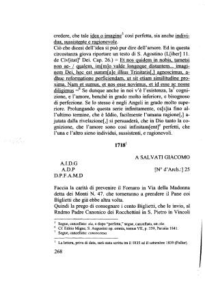 Ciò che dicesi dell ’ idea si può pur dire dell ’ amore . Ed in questa circostanza giova riportare un testo di S . Agostino ( Lfiber ] 11 . de Civ [ itat ] e Dei . Cap . 26 .) - Et nos quidem in nobis , tametsi non ae- / qualem , imlmlo valde longeque distantem ... imaginem Dei , hoc est summlale illius Trini tatisl . l agnoscimus , a- dhuc reformatione perficiendam , ut sit etiam similitudine proxima . Nam et sumus , et nos esse novimus , et id esse ac nosse diligimus = 6 Se dunque anche in noi v ’ è l ’ esistenza , la7 cognizione , e l ’ amore , benché in grado molto inferiore , e bisognoso di perfezione . Se lo stesso è negli Angeli in grado molto superiore . Prolungando questa serie infinitamente , os [ s ] ia fino all ’ ultimo termine , che è Iddio , facilmente l ’ umana ragione [,] a- jutata dalla rivelazione [,] si persuaderà , che in Dio tanto la cognizione , che l ’ amore sono cosi infinitam [ ent ] e perfetti , che l ’ una e l ’ altro sieno individui , sussistenti , e ragionevoli .