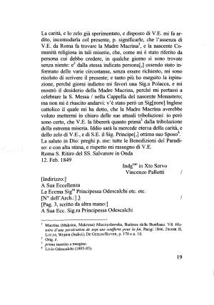La carità , e lo zelo già sperimentato , e disposto di V . E . mi fa ardito , incomodarla col presente , p . significarle , che l ’ assenza di V . E . da Roma fa trovare la Madre Macrina ’, e la nascente Comunità religiosa in tali miserie , che , come mi è stato riferito da persona cui debbo credere , in qualche giorno si sono trovate senza niente : e12 dalla stessa indicata personaf ,] essendo stato informato delle varie circostanse , senza essere richiesto , mi sono risoluto di scrivere il presente ; e tanto più ho eseguito la ispirazione , perché giorni indietro mi favorì una Sig . a Polacca , e mi mostrò il desiderio della Madre Macrina , perché mi portassi a celebrare la S . Messa / nella Cappella del nascente Monastero ; ma non mi è riuscito andarvi : v ’ è stato però un Sig [ nore ] Inglese cattolico il quale mi ha detto , che la Madre Macrina averebbe