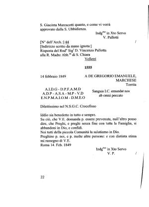 Risposta del Rnd ° Sigr D . Vincenzo Palletta alla R . Madre Abb . sa di S . Chiara Velletri