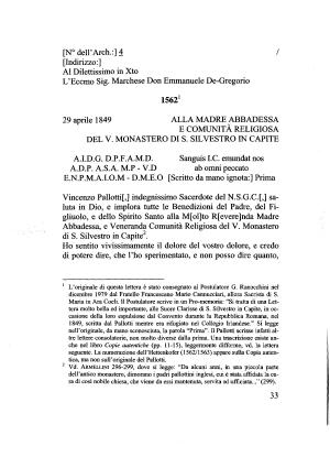 Maria in Ara Coeli . Il Postulatore scrive in un Pro-memoria : “ Si tratta di una Lettera molto bella ed importante , alle Suore Clarisse di S . Silvestro in Capite , in occasione della loro espulsione dal Convento durante la Repubblica Romana , nel
