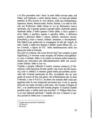 Vigilate e pregate affinché il nostro comune nemicof ,] il Demonio [,] colla memoria di tutto quello , che avete dovuto lasciare [,] non vi rubbi (!) il minimo grado della più perfetta uniformità alla Volontà santissima di Dio , ricordando che un solo grado di amore di Dio nel patire vale infinitamente più di tutto il Mondo ; e che il N . S . G . C . ha detto che saranno date come per aggiunta tutte le cose temporali necessarie per vivere su questa