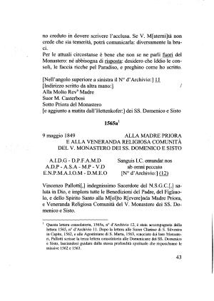 1 Questa lettera consolatoria , 1565a , n ° d ’ Archivio 12 , è stata accompagnata dalla lettera 1565 , n ° d ’ Archivio 11 . Dopo la lettera alle Suore Clarisse di S . Silvestro in Capite , 1562 , e alle Agostiniane di S . Marta , 1563 , scacciate dai loro Monasteri , Pallotti scrisse la terza lettera consolatoria alle Domenicane dei SS . Domenico e Sisto , lasciandosi guidare dalla stessa profondità spirituale che rispecchiano le missive 1562 e 1563 .