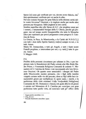 Profitto della presente circostansa per salutare in Dio , e per implorare tutte le Benedizioni del Padre celeste alla Mto Rnda Madre Priora , e Veneranda Religiosa Comunità di codesto V . Monastero di S . Caterina da Siena : e mi raccomando alle loro fervorose Orazioni . Oh quanto sono ammirabili i disegni del Padre delle Misericordie mentre permette , che i figli delle tenebre vieppiù corrano nelle vie del peccato , dona ai figli della luce innumerabili grazie per moltiplicare le opere sante , i meriti , e la perfezione delle virtù cristiane ! Colla Ven [ erabile ] Religiosa ]