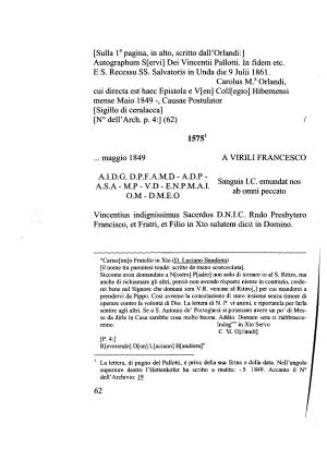 Carolus M . a Orlandi , cui directa est haec Epistola e V [ en ] Coll [ egio ] Hibemensi mense Maio 1849 - , Causae Postulator [ Sigillo di ceralacca ] [ N ° dell ’ Arch . p . 4 :] ( 62 ) /